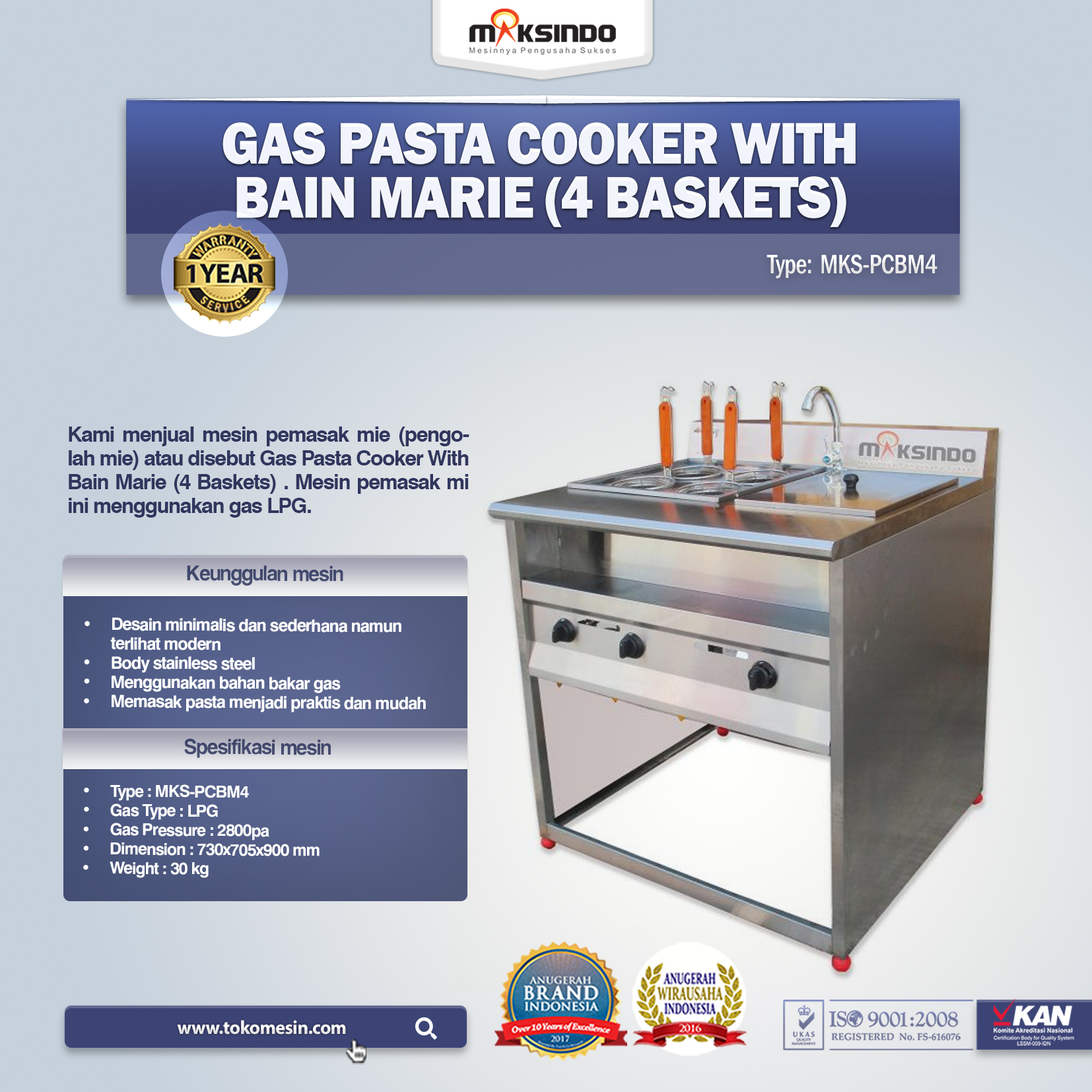 Gas pasta cooker with bain marie type MKS-PCBM44 adalah termasuk produk dari Maksindo yang sangat pas untuk diimplikasikan dalam kegiatan bisnis seperti usaha rumah makan, hotel ataupun restoran. Mesin gas pasta ini mempunyai desain yang sangat dinamis yang mempunyai kegunaan untuk memasak mie atau memasak pasta dengan cara yang lebih mudah dan lebih praktis. Ada bermacam pilihan mesin gas pasta dari Maksindo salah satunya adalah gas pasta dengan type MKS-PCBM4. Dalam proses kerjanya mesin ini memakai sumber tenaga yang tentu sangat hemat.